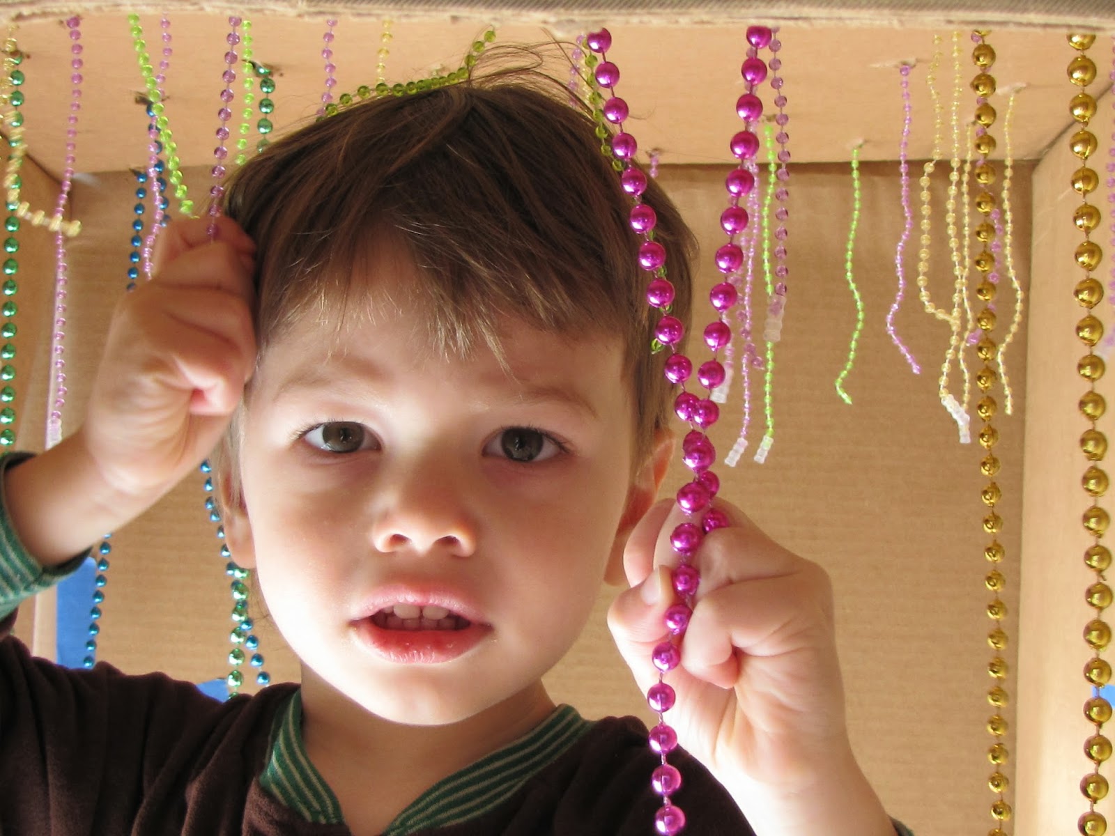 crow's nest for Austin's pirate party, with some black cloth and skeletons. For this, I tied ribbons all around the inner hoop and then tied balloons on the ribbons and then slid them around until it looked dense enough. Then I put the outer hoop on and suspended it from our chandelier over the table. Very easy! And when Daddy took it down, he put the balloons to good use in the play pen.